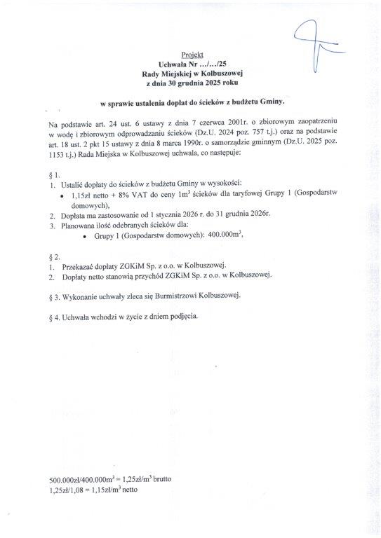 Podjęcie uchwały w sprawie ustalenia dopłat do ścieków z budżetu Gminy Kolbuszowa.